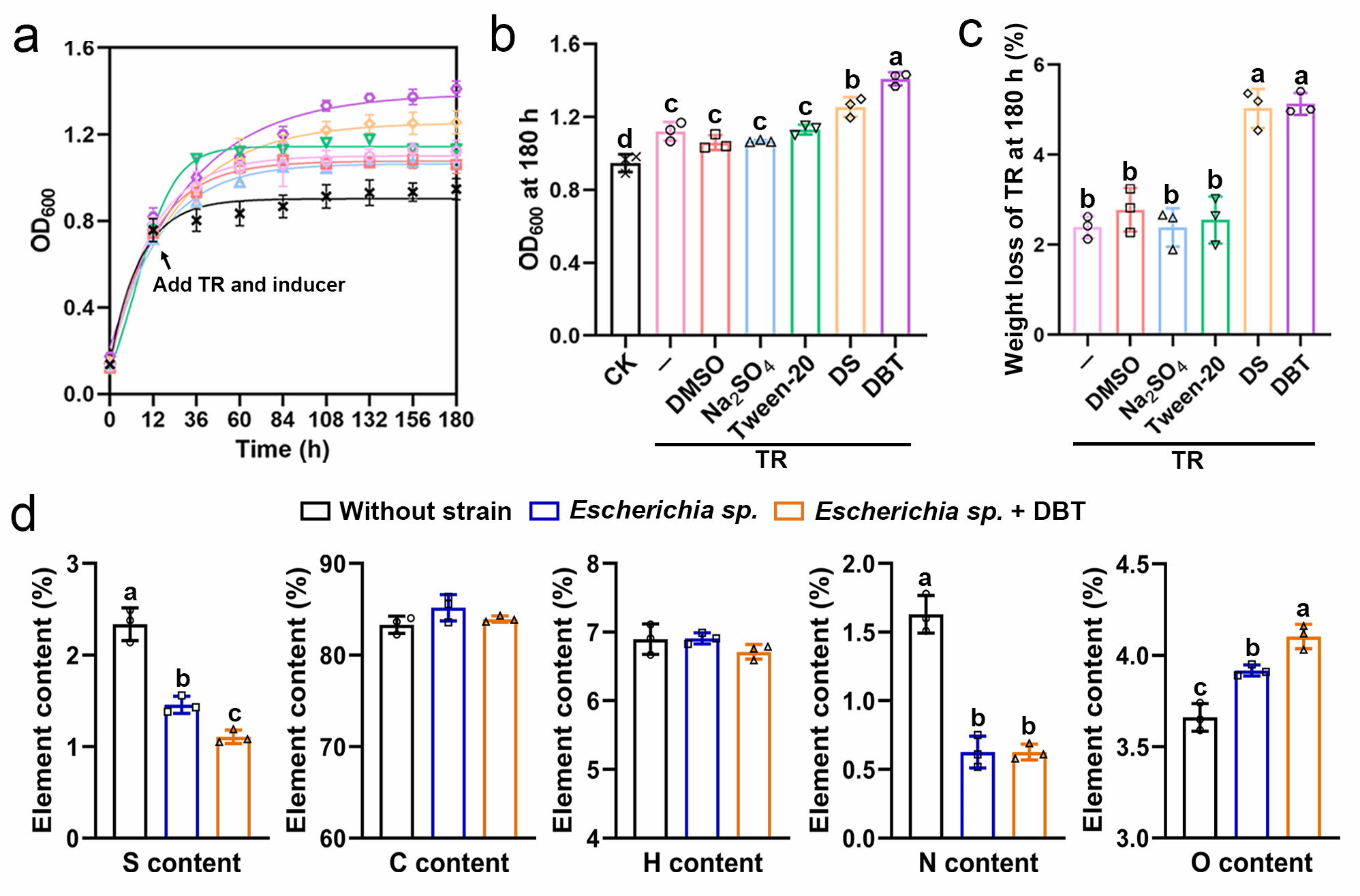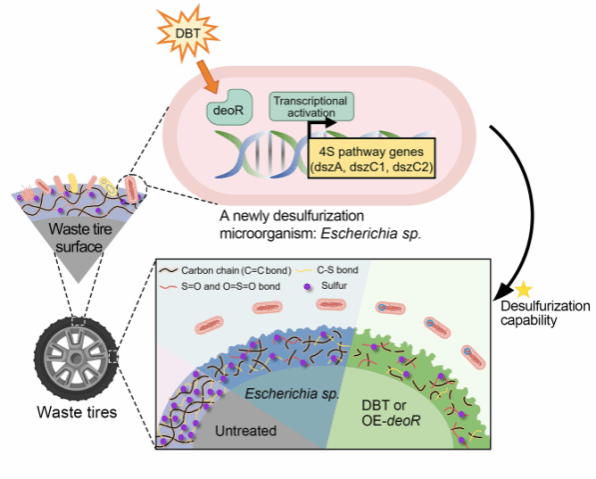 我院微生物生理代谢与绿色发酵团队,以废弃轮胎橡胶为研究材料,从废弃轮胎表面新分离出一株高效脱硫埃希氏菌,发现外源添加二苯并噻吩(DBT)显著提高了埃希氏菌对TR的脱硫能力。进一步通过转录组、基因敲除和过表达等技术发现,过表达转录因子deoR能够有效提高埃希氏菌对TR的脱硫能力。成果以“Exogenous DBT and overexpression of deoR improved the waste tire rubber desulfurization ability of a newly isolated Escherichia sp. strain”为题,发表在国际环境科学领域中科院1区Top期刊《Journal of Hazardous Materials》(IF2024: 11.3)。硕士研究生陆瑶为论文第一作者,刘勇男副教授为通讯作者,团队负责人刘高强教授对该研究提供了指导和支持。