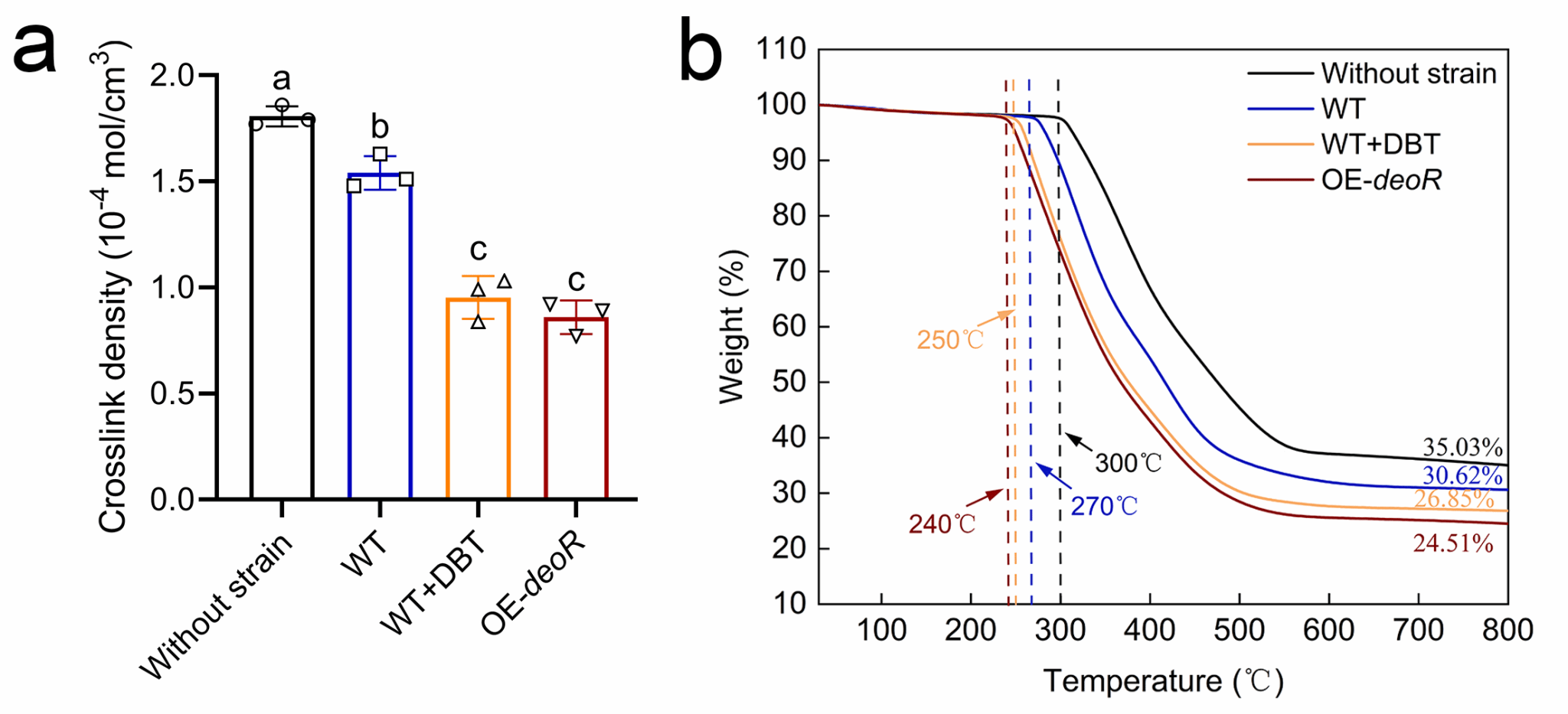 测定TR的交联度表明,过表达deoR较WT处理更显著降低了TR的交联度;热重分析显示,埃希氏菌处理降低了TR的热解起始温度,其中过表达deoR处理使TR的热解起始温度降低至240℃,TR的残留质量为24.51%,表明在OE-deoR菌株的处理下,TR的热稳定性下降(图6)。
