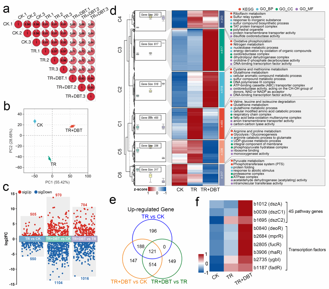 通过转录组学分析,筛选得到受到DBT诱导调控的3个4S途径脱硫基因b1012、b0039和b1695以及6个转录因子b0840、b2684、b2805、b3906、b2735和b1187(图2)。