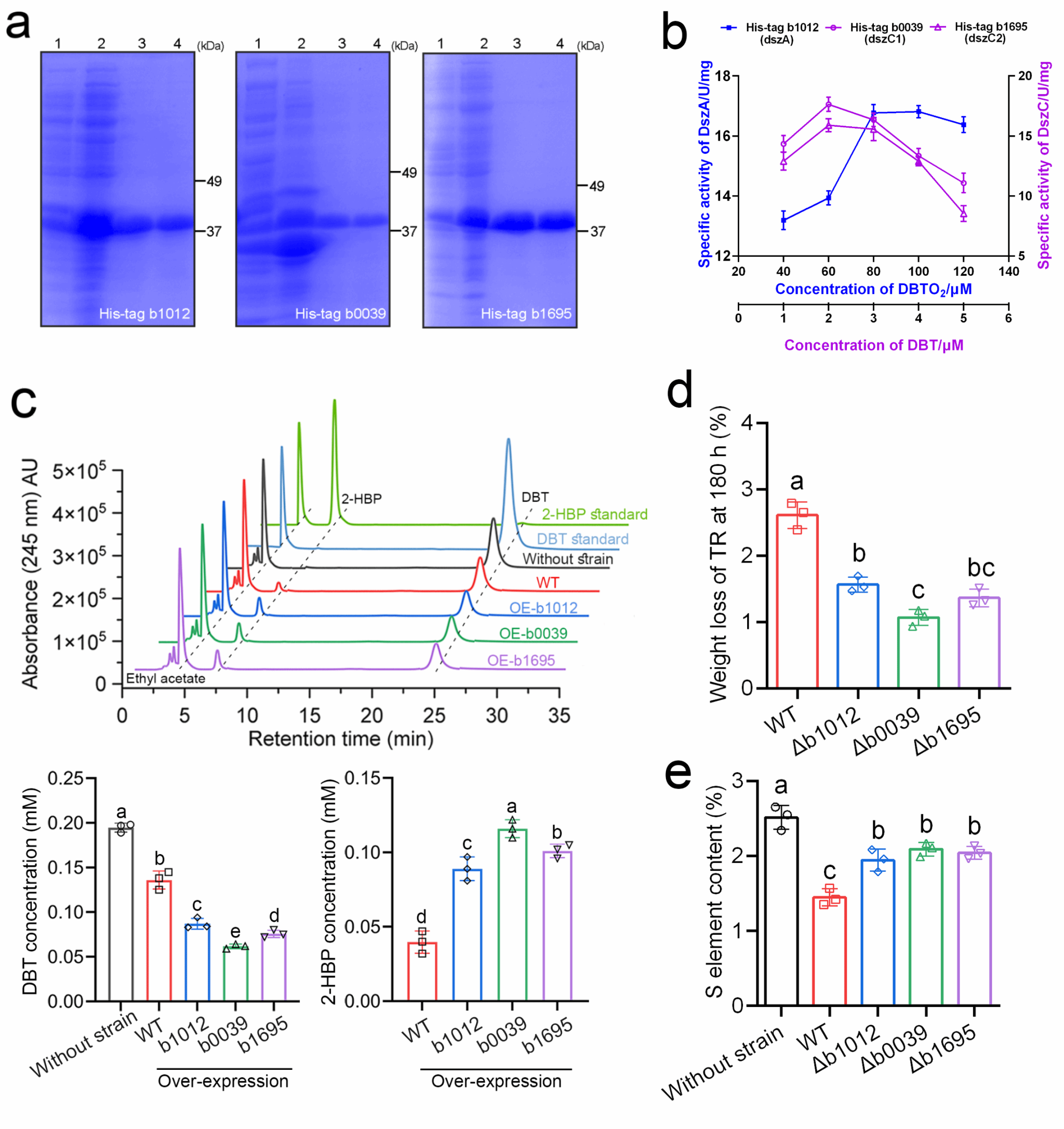 对三个4S脱硫基因进行结构域预测表明,b1012编码dszA单加氧酶,b0039和b1695编码dszC脱硫酶。通过酶活测定、基因敲除及基因过表达分析,验证了3个4S基因b1012、b0039和b1695在脱硫过程中的作用(图3)。