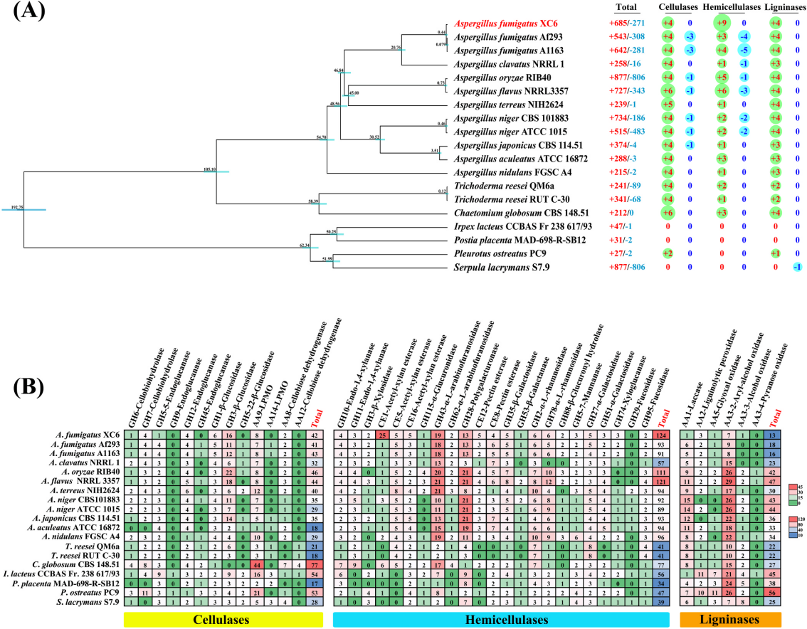 1.比较基因组学和系统发育基因组学揭示了烟曲霉XC6庞大且扩张的木质纤维素降解酶系, 该菌基因组含658个碳水化合物活性酶(CAZymes)基因,数量居曲霉菌属首位。该菌17个木质纤维素降解酶基因家族均经历了显著的扩张,其中乙酰木聚糖酯酶(CE1家族)扩张至25个,远高于比较菌株(图1)。