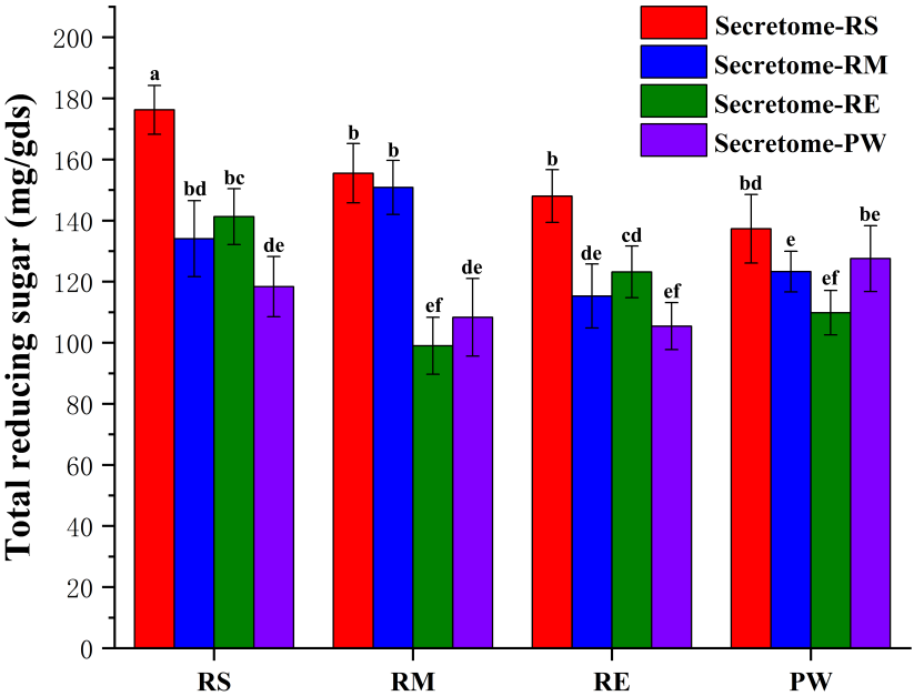 3、生物质酶解糖化分析显示烟曲霉XC6木质纤维素降解酶系对不同生物质底物的高效糖化能力,不同生物质诱导的该菌分泌组对该生物质底物糖化效果最好,其中,水稻秸秆诱导的分泌组对该底物糖化得率最高,达到176.25 mg/gds(图3)。
