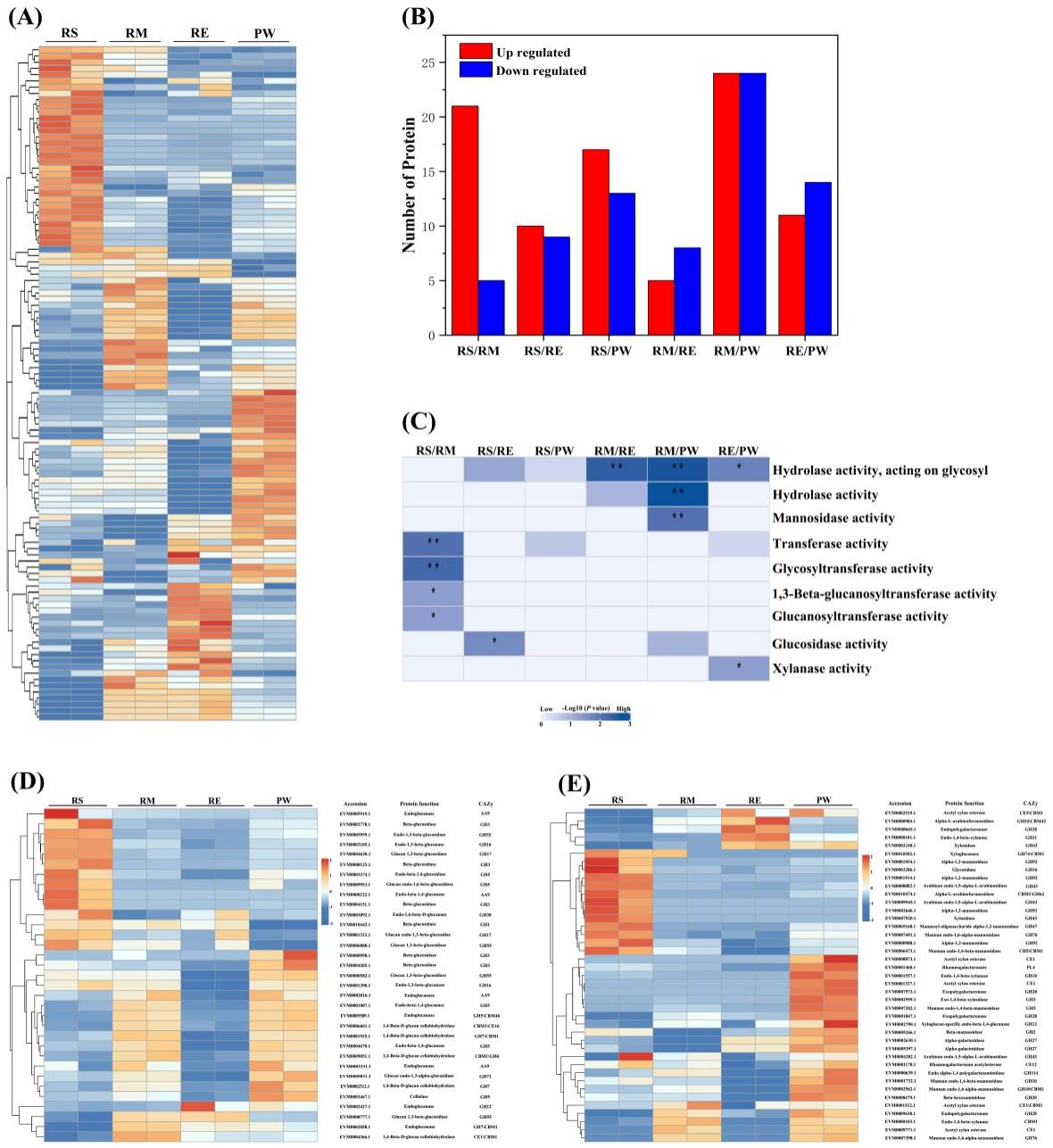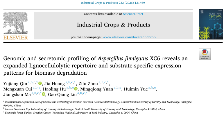 我院微生物生理代谢与绿色发酵团队,针对一株高效降解木质纤维素的烟曲霉(Aspergillus fumigatus)XC6,通过系统发育基因组学、比较基因组学及定量分泌蛋白质组学等技术,阐明了其木质纤维素降解酶系组成、进化及其响应不同生物质底物的特异性表达调控规律,研究成果以题为“Genomic and secretomic profiling of Aspergillus fumigatus XC6 reveals an expanded lignocellulolytic repertoire and substrate-specific expression patterns for biomass degradation”发表于农林科学领域国际知名一区TOP期刊《Industrial Crops & Products》。在读硕士研究生覃榆江、博士研究生黄佳和硕士研究生周自璐为共同第一作者,马江山副教授和刘高强教授为通讯作者。该研究得到湖湘青年英才(2022RC1153)、湖南省自然科学基金(2024JJ5633)和湖南省科技创新团队项目(2021RC4063)等项目的支持与资助。