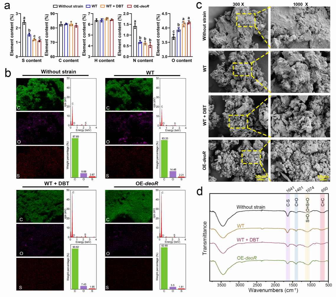 有机元素含量分析和X射线能谱分析显示,过表达deoR显著降低了TR中的硫含量。扫描电镜和红外光谱分析进一步发现,OE-deoR菌株能更有效地破坏TR表面结构,显著降低了TR中C=C和C-S键的强度,增加了S=O和O=S=O键的强度(图5)。
