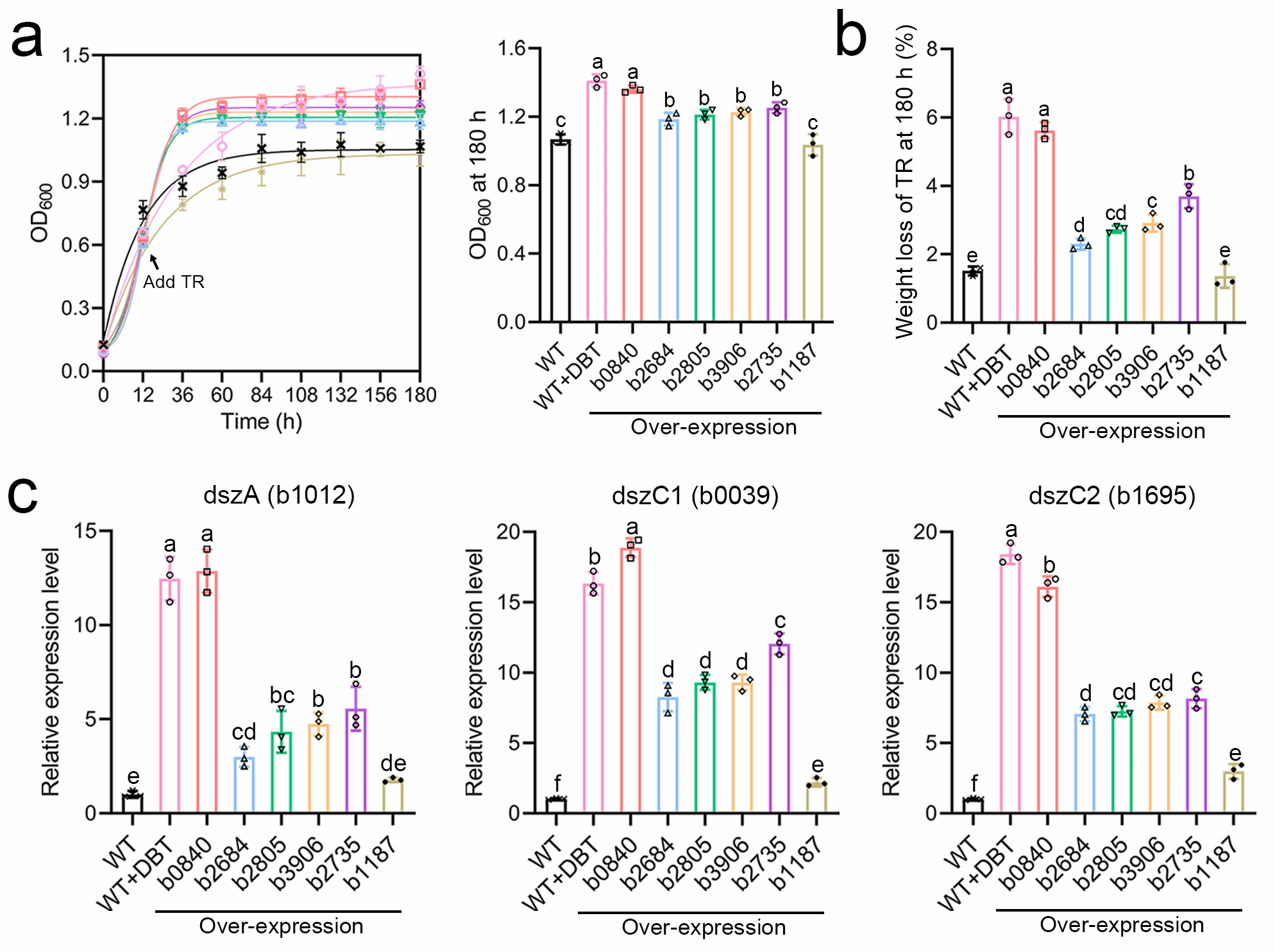 在埃希氏菌中过表达6个转录因子均能够显著增强4S脱硫基因的转录和对TR的脱硫能力,其中过表达编码deoR型转录因子b0840对4S基因的转录上调及脱硫能力的提高效果最强(图4)。