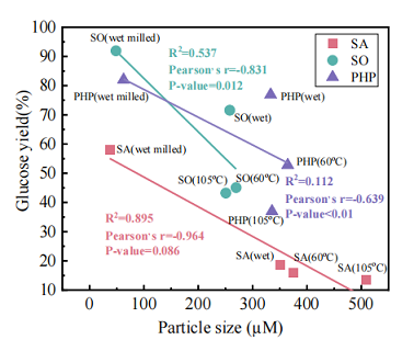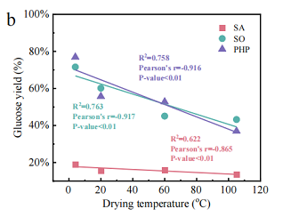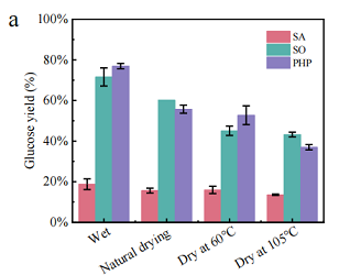 研究结论:结果表明,预处理杨木酶解葡萄糖产量的增加与其干燥温度的升高呈负相关。湿法处理是有益的,因为它改善了酶液化的传质和渗透性。在联合预处理后,机械湿磨将进一步提高酶解效率。采用这种组合预处理方法,产量可望从4.79%到91.93%,提高87.14%。这增加了杨木水解酶促反应的效率,有利于工业化生产应用。