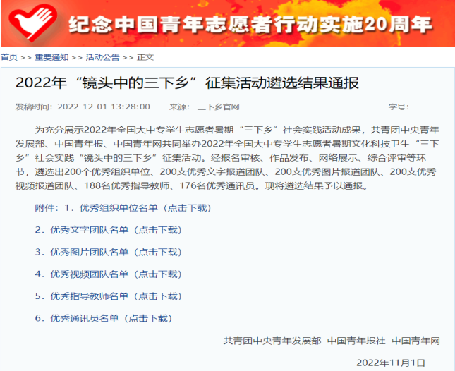 (生科学院)近日,团中央公布2022年全国大中专学生志愿者暑期“三下乡”社会实践“镜头中的三下乡”活动遴选结果,我校生命科学与技术学院党员博士赴湖南省岳阳市东洞庭湖生态区绿色发展调研团荣获优秀图片团队。